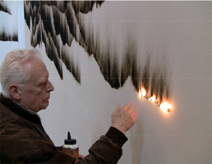 Christian Jaccard, le « pyronaute », insvestit un espace vide et allume une mèche... La performance du feu a eu lieu en avril à l'Arsenal de Soissons dans le cadre de l'exposition « Au pied du mur II » proposée par le Frac Picardie. Energies dissipées est le titre de l'importante exposition personnelle dédiée à l'artiste en regard de cette œuvre éphémère intitulée « au droit des murs de l'Arsenal » que l'artiste définit ainsi : « Le rêve du pyronaute, dans son action mêlée à la méditation, laisse apparaître les traces de suie aux soubresauts tranquilles, épars ou concentrés, des lignes juxtaposées semblables à une chaîne de massifs montagneux avec crêtes, précipices et flexures au sein desquels l'espoir des flammes renouvelées n'est à son tour qu'un rêve évanoui. »