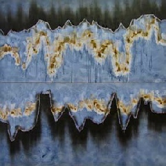 Suggérés par les « flambées » de la Bourse, les pics de combustion sont majoritairement des diptyques où l’évolution des Brûlis agit par infiltration dans la texture du support, révélant ainsi la transformation chimique de la matière et le pouvoir transcendantal du feu dans la couleur. Les fluctuations de la combustion dégagent « leurs marges opérationnelles, leurs indices d’actifs et de croissance… »