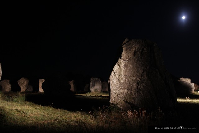 Imaginez… 4.000 pierres érigées, sans que l’on sache réellement expliquer pourquoi, la nuit qui tombe, déchirée de lumières, planant autour de ces alignements dont une légende dit qu’ils sont des soldats romains figés ainsi par le Saint qu’ils poursuivaient. Yann Kersalé poursuit son road-